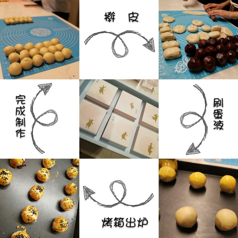 在老師專業(yè)示范和講解之后,大家迫不及待地拿起工具開始制作,忙得不亦樂乎,還時(shí)不時(shí)與身邊同事互相交流著剛才的教學(xué)示范。面粉、蛋黃、豆沙,空氣中香甜四處彌漫;搟面、烘烤、包裝,勞動(dòng)中充滿歡聲笑語。在包好的月餅上涂上蛋黃液,再撒上芝麻,送入烤箱中加熱30分鐘??粗@些親手制作的月餅新鮮出爐,每個(gè)人都異常滿足,紛紛拍照留念。雖然每個(gè)人都是第一次動(dòng)手制作月餅,但是都做得有模有樣,大家相互欣賞著哪個(gè)做的好看,哪組做的快,興致勃勃地相互夸獎(jiǎng)著成品佳作,感受濃濃的節(jié)日氣氛。